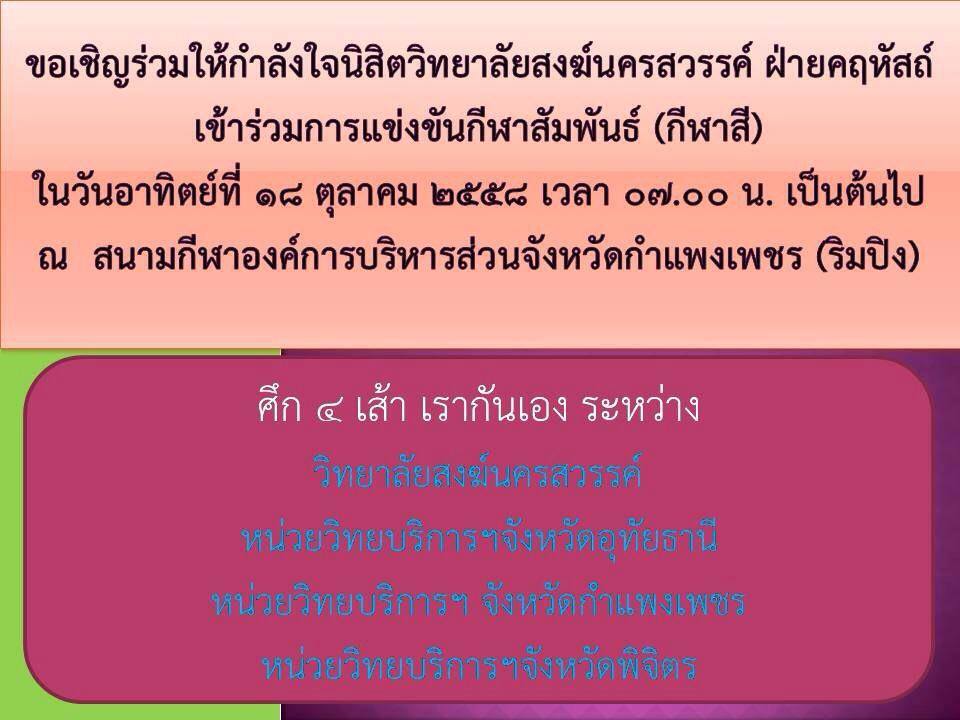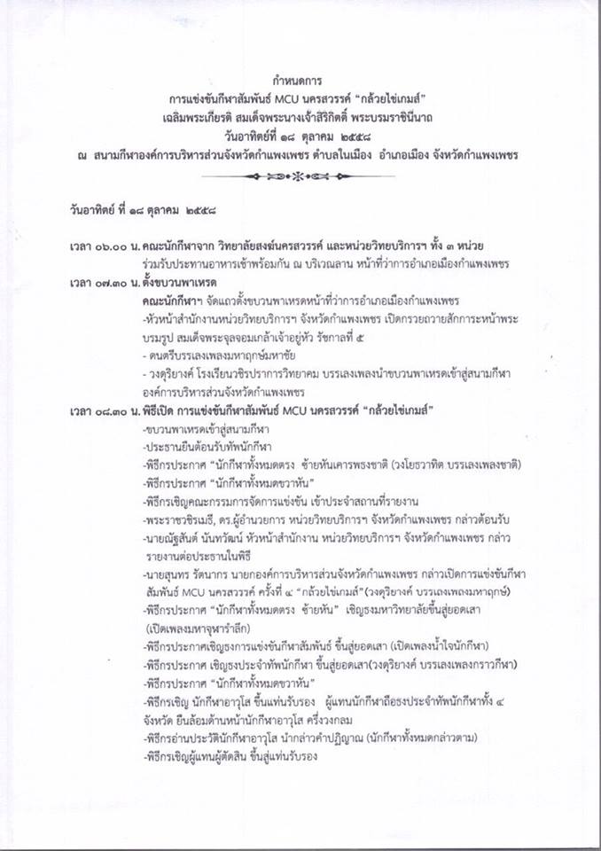 Share Facebook Twitter LinkedIn Pinterest Email กำหนดการ การแข่งขันกีฬาสัมพันธ์ MCU นครสวรรค์ “กล้วยไข่เกมส์” วันอาทิตย์ที่ 18 ตุลาคม 2558 ณ สนามกีฬาองค์การบริหารส่วนจังหวัดกำแพงเพชร อำเภอเมือง จังหวัดกำแพงเพชร Related posts:ตารางสอบปริญญาตรี ประจำภาคการศึกษาที่ 2/2560ประกาศมหาวิทยาลัยมหาจุฬาลงกรณราชวิทยาลัย วิทยาเขตนครสวรรค์ เรื่อง เปิดรับสมัครพระภิกษุ สามเณรและบุคค...บันทึกข้อตกลงความร่วมมือทางวิชาการ (MOU) การแลกเปลี่ยนความรู้และพัฒนาความร่วมมือด้านนวัตกรรมเตาเผาขย...