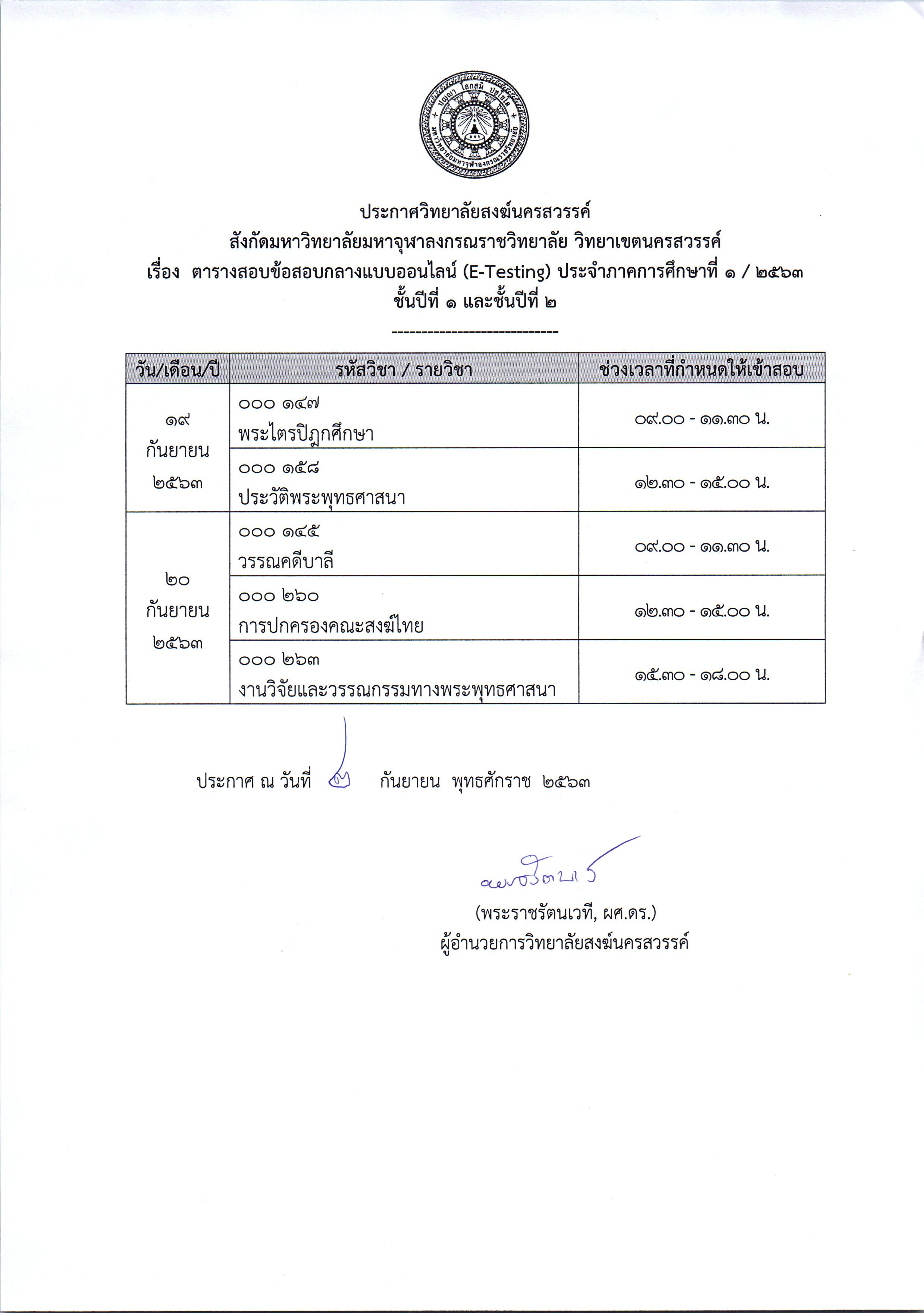 อาศัยอำนาจตามความในมาตรา ๒๗ (๒) แห่งพระราชบัญญัติมหาวิทยาลัยมหาจุฬาลงกรณราชวิทยาลัย พ.ศ. ๒๕๔๐ จึงออกประกาศมหาวิทยาลัยมหาจุฬาลงกรณราชวิทยาลัย เรื่อง การจัดสอบวัดผลการศึกษารายวิชาข้อสอบกลาง ภาคการศึกษาที่ ๑ ปีการศึกษา ๒๕๖๓ โดยการสอบแบบระบบออนไลน์ (E- Testing) ตามตารางสอบ