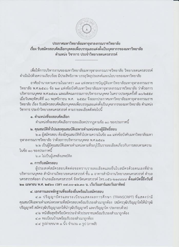 เรื่อง รับสมัครบุคคลเพื่อบรรจุและแต่งตั้งเป็นบุคลากรของมหาวิทยาลัย ตำแหน่ง วิชาการประจำวิทยาเขตนครสวรรค์
