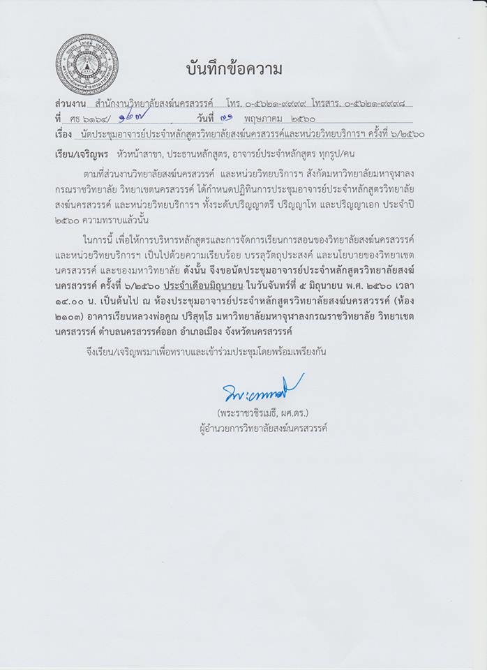 ขอเชิญประชุมอาจารย์อาจารย์ประจำหลักสูตรวิทยาลัยสงฆ์นครสวรรค์และหน่วยวิทยบริการฯ ครั้งที่ ๖/๒๕๖๐ ประจำเดือนมิถุนายน