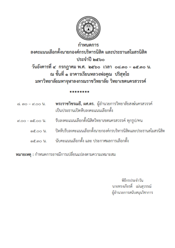 กำหนดการลงคะแนนเลือกตั้งนายกองค์กรบริหารกิจการนิสิต และ ประธานสโมสรนิสิต ประจำปี 2560