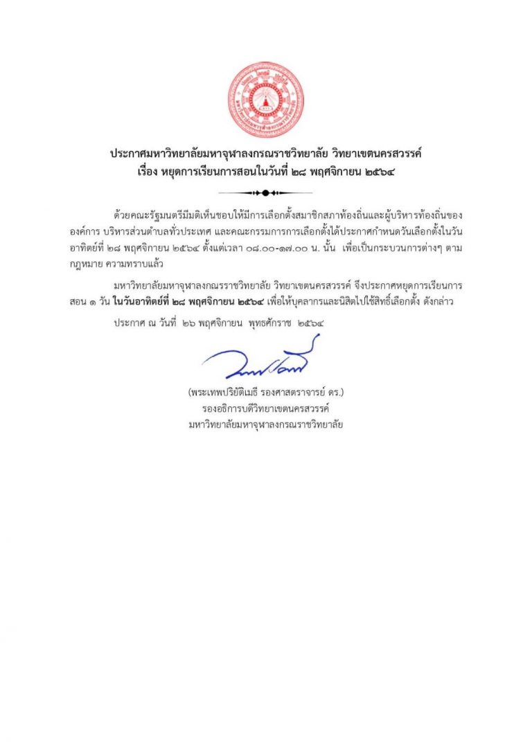 ประกาศมหาวิทยาลัยมหาจุฬาลงกรณราชวิทยาลัย วิทยาเขตนครสวรรค์ เรื่อง หยุดการเรียนการสอนในวันที่ ๒๘ พฤศจิกายน ๒๕๖๔ ด้วยคณะรัฐมนตรีมีมติเห็นชอบให้มีการเลือกตั้งสมาชิกสภาท้องถิ่นและผู้บริหารท้องถิ่นขององค์การ บริหารส่วนตำบลทั่วประเทศ และคณะกรรมการการเลือกตั้งได้ประกาศกำหนดวันเลือกตั้งในวันอาทิตย์ที่ ๒๘ พฤศจิกายน ๒๕๖๔ ตั้งแต่เวลา ๘.๐๐-๑๗.๐๐ น. นั้น เพื่อเป็นกระบวนการต่างๆ ตามกฎหมาย ความทราบแล้ว…