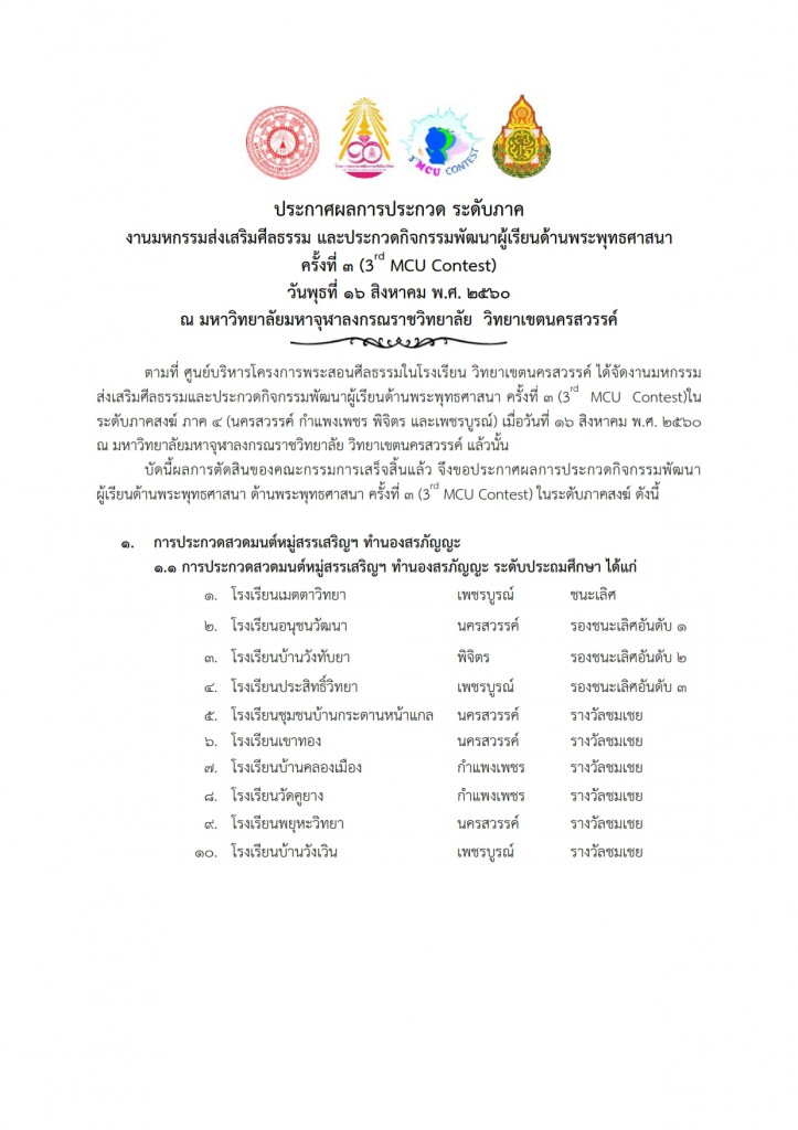 ประกาศผลการประกวด ระดับภาค งานมหกรรมส่งเสริมศีลธรรม และประกวดกิจกรรมพัฒนาผู้เรียนด้านพระพุทธศาสนา ครั้งที่ ๓ (3rd MCU Contest) **ทีมชนะเลิศแต่ละรายการ จะได้เป็นตัวแทนภาค เข้าร่วมประกวดกิจกรรมฯ ระดับประเทศในวันที่ ๑๕-๑๗ กันยายน พ.ศ. ๒๕๖๐ ณ มหาวิทยาลัยมหาจุฬาลงกรณราชวิทยาลัย อำเภอวังน้อย จังหวัดพระนครศรีอยุธยา…
