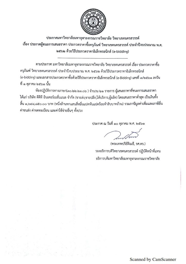 ประกาศ มจร วิทยาเขตนครสวรรค์ เรื่อง ประกาศผู้ชนะการเสนอราคา ประกวดราคาซื้อครุภัณฑ์ วิทยาเขตนครสวรรค์ ประจำปีงบประมาณ ๒๕๖๒ ด้วยวิธีการประกวดราคาอิเล็กทรอนิกส์ (e-biddings)
