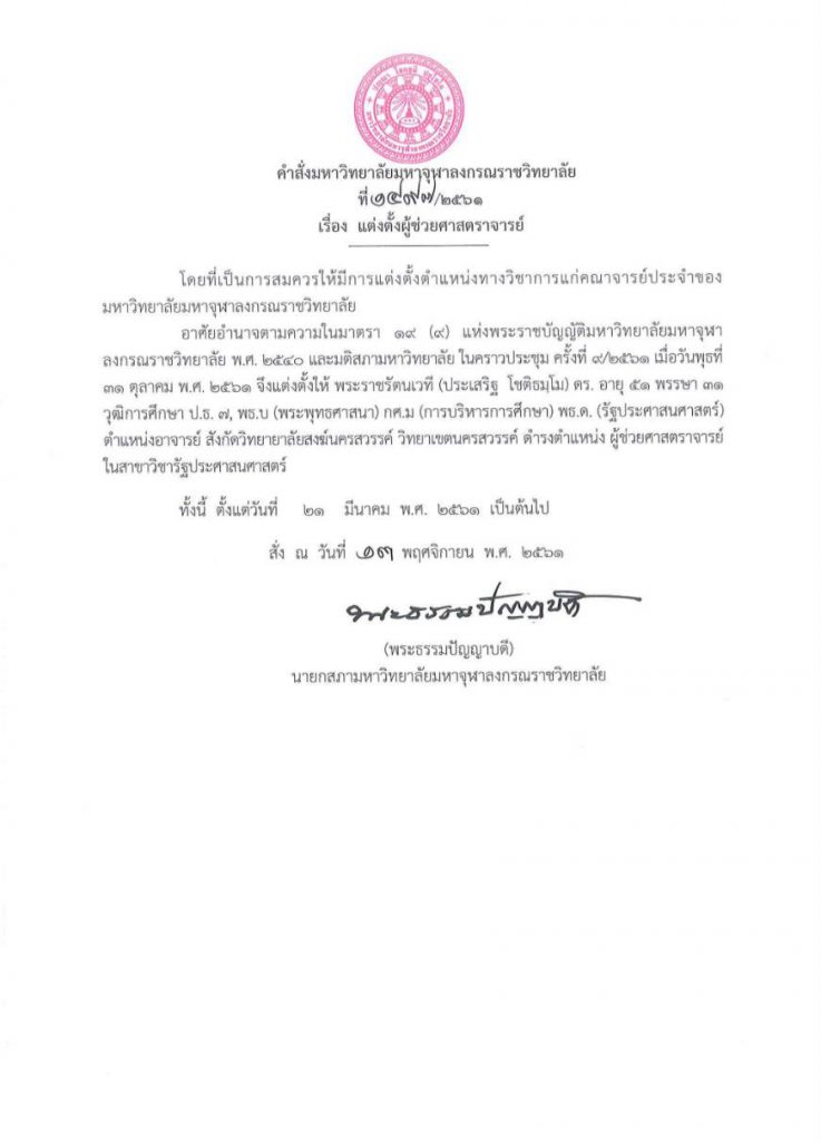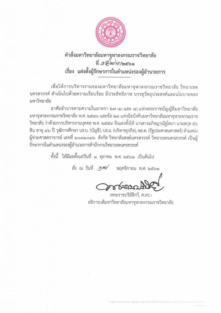 คำสั่งมหาวิทยาลัยมหาจุฬาลงกรณราชวิทยาลัย แต่งตั้งผู้รักษาการในตำแหน่งผู้อำนวยการ , แต่งตั้งผู้รักษาการในตำแหน่งรองผู้อำนวยการ , แต่งตั้งผู้ดำรงตำแหน่งรองผู้อำนวยการ 1. พระราชรัตนเวที, ผศ.ดร. ดำรงตำแหน่ง “รักษาการผู้อำนวยการวิทยาลัย วิทยาลัยสงฆ์นครสวรรค์” 2. ผศ.ดร.อภิชญาณัฐโสภา อบสิน ดำรงตำแหน่ง “รักษาการรองผู้อำนวยการสำนักงานวิทยาเขตนครสวรรค์” 3. ผศ.ดร.อัครเดช พรหมกัลป์…