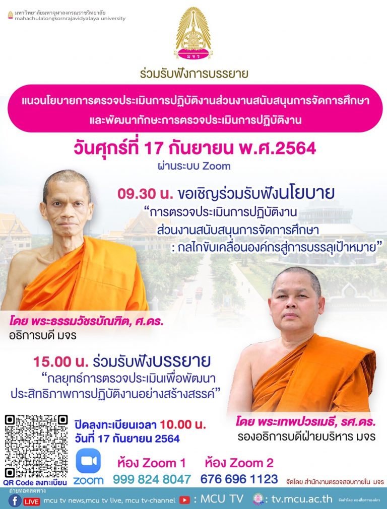 ขออาราธนา/เรียนเชิญ ผู้บริหาร คณาจารย์ เจ้าหน้าที่ ทุกรูป/คน เข้าร่วมโครงการสัมมนาเชิงปฏิบัติการการจัดทำแผนพัฒนามหาวิยาลัยมหาจุฬาลงกรณราชวิทยาลัย วิทยาเขตนครสวรรค์ ในช่วงแผนพัฒนาการศึกษาระดับอุดมศึกษา ระยะที่ 13 (พ.ศ.2565 – 2569) และจัดทำแผนปฏิบัติการประจำปีงบประมาณ 2565 ระหว่างวันที่ 6 – 8 สิงหาคม…
