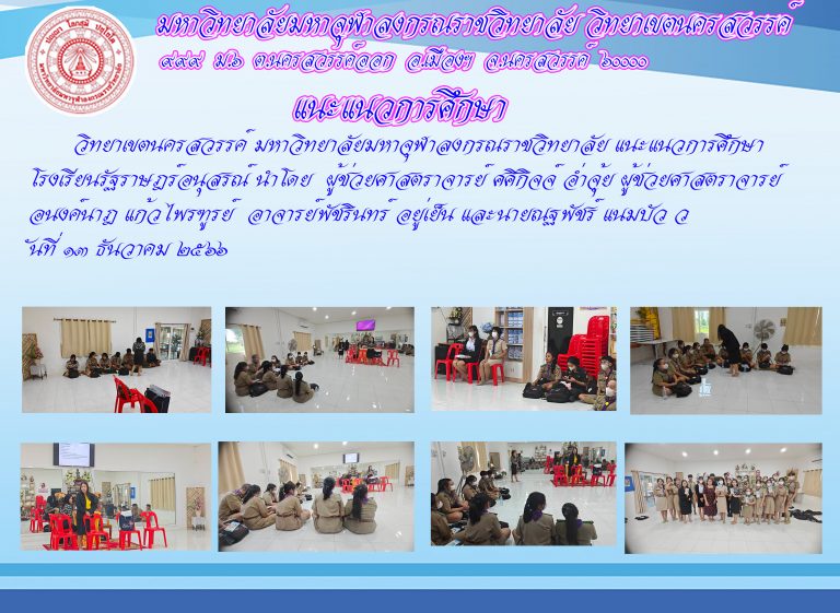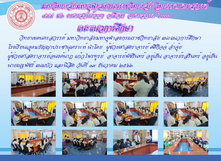 วิทยาเขตนครสวรรค์ มหาวิทยาลัยมหาจุฬาลงกรณราชวิทยาลัย แนะแนวการศึกษา โรงเรียนรัฐราษฎร์อนุสรณ์ นำโดย ผู้ช่วยศาสตราจารย์ ศศิกิจจ์ อ่ำจุ้ย ผู้ช่วยศาสตราจารย์ อนงค์นาฎ แก้วไพรฑูรย์ อาจารย์พัชรินทร์ อยู่เย็น และนายณฐพัชร์ แนมบัว ว ันที่ ๑๓ ธันวาคม ๒๕๖๖