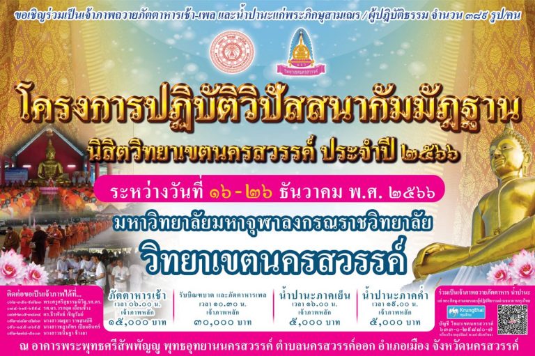 ขอเชิญร่วมเป็นเจ้าภาพถวายภัตตาหารเช้า – เพล และน้ำปานะแก่พระภิกษุ สามเณร/ผู้ปฏิบัติธรรม โครงการปฏิบัติวิปัสสนากัมมัฏฐาน ประจำปีการศึกษา 2566 ระหว่างวันที่ 16-26 ธันวาคม พ.ศ. 2566 ณ อาคารประดิษฐานองค์พระพุทธศรีสัพพัญญู พุทธอุทยานนครสวรรค์ อำเภอเมือง จังหวัดนครสวรรค์ #นิสิตบรรพชิตและคฤหัสถ์ เข้าร่วม…