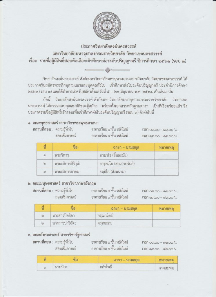 รายชื่อผู้มีสิทธิ์สอบคัดเลือกเข้าศึกษาต่อระดับปริญญาตรี ปีการศึกษา ๒๕๖๑ (รอบ ๓)