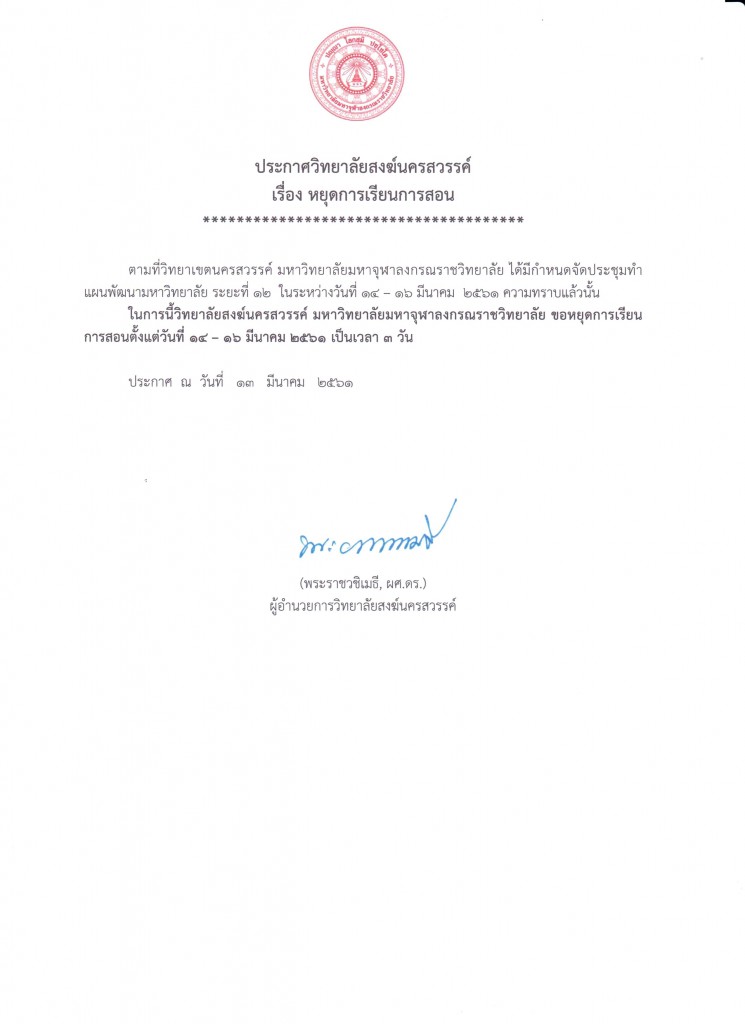 ประกาศวิทยาลัยสงฆ์นครสวรรค์ เรื่อง หยุดการเรียนการสอน