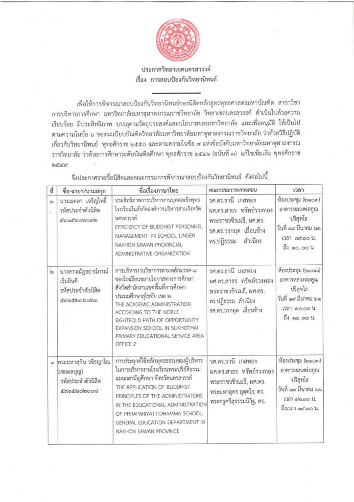 ประกาศวิทยาเขตนครสวรรค์ เรื่อง การสอบป้องกันวิทยานิพนธ์