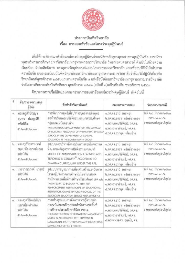 ประกาศการสอบหัวข้อและโครงร่างวิทยานิพนธ์ หลักสูตรพุทธศาสตรมหาบัณฑิต