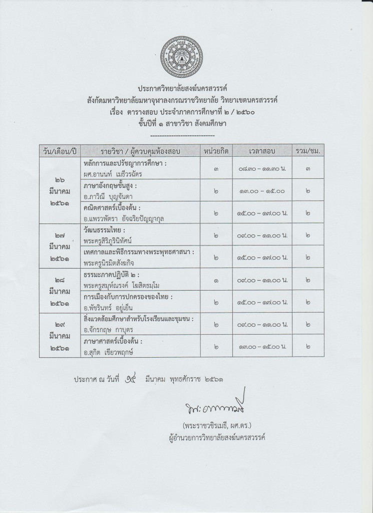 ตารางสอบปริญญาตรี ประจำภาคการศึกษาที่ 2/2560