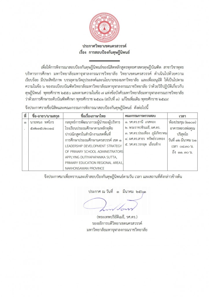 ประกาศวิทยาเขตนครสวรรค์ เรื่อง การสอบป้องกันดุษฎีนิพนธ์