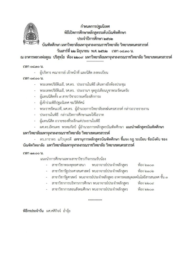 กำหนดการปฐมนิเทศ พิธีเปิดการศึกษาหลักสูตรระดับบัณฑิตศึกษา ประจำปีการศึกษา ๒๕๖๒