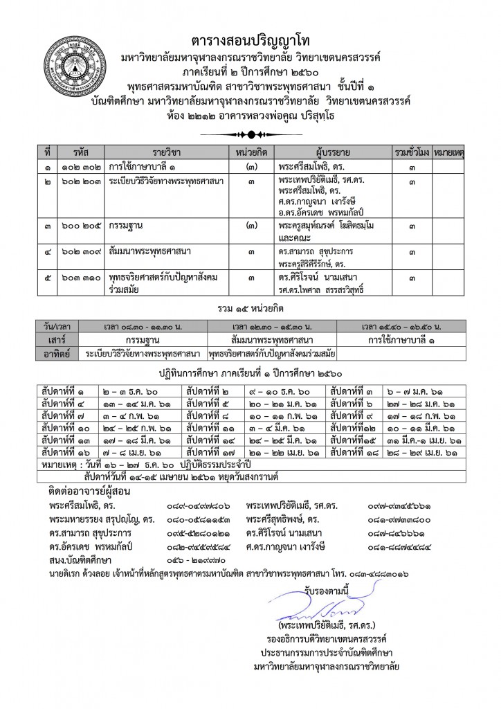 ตารางสอน ปริญญาเอก ภาคเรียนที่ 2/59 สาขาวิชา พุทธบริหารการศึกษา