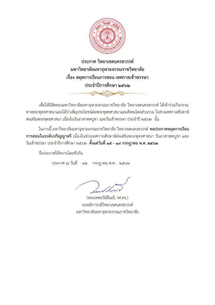 ประกาศมหาวิทยาลัยมหาจุฬาลงกรณราชวิทยาลัย วิทยาเขตนครสวรรค์ เรื่อง ปฏิทินการศึกษาระดับปริญญาตรี ภาคเรียนที่ ๒ ปีการศึกษา ๒๕๖๗07/11/2025