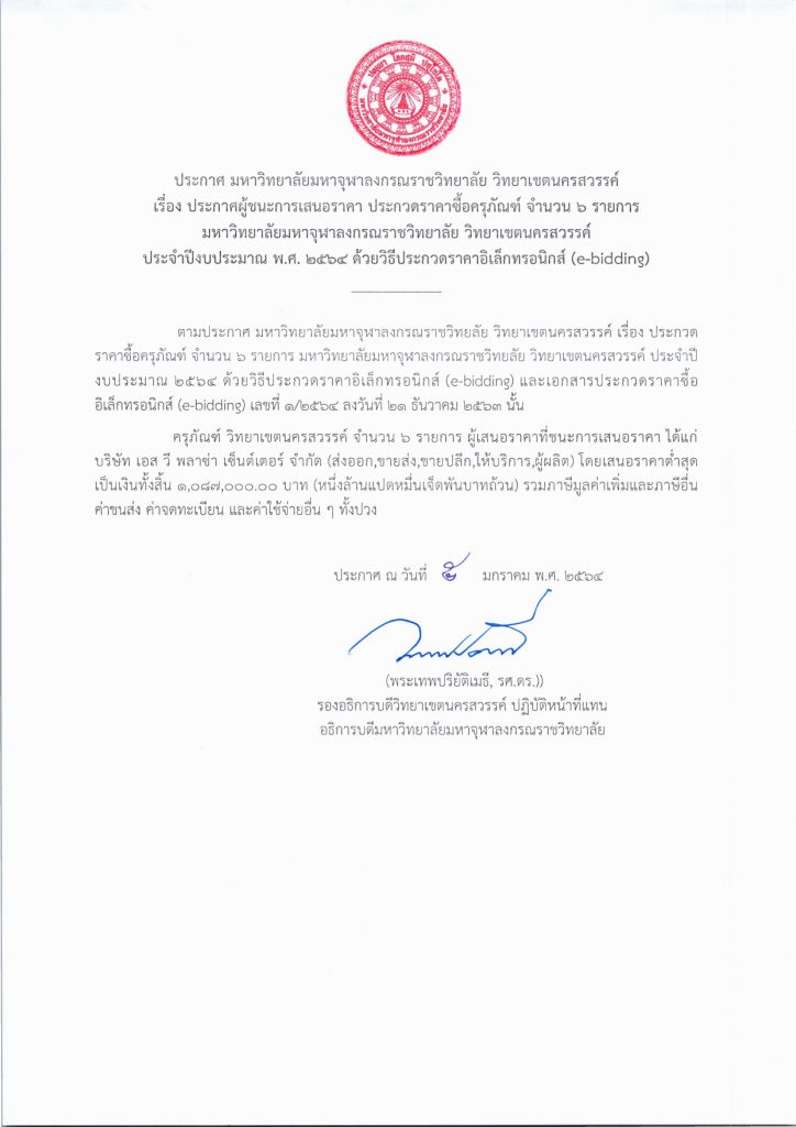 ประกาศ มหาวิทยาลัยมหาจุฬาลงกรณราชวิทยาลัย วิทยาเขตนครสวรรค์ เรื่อง ประกาศผู้ชนะการเสนอราคา ประกวดราคาจ้างปรับปรุงอาคารเรียน วิทยาเขตนครสวรรค์ ตำบลนครสวรรค์ออก อำเภอเมืองนครสวรรค์ จังหวัดนครสวรรค์30/03/2023