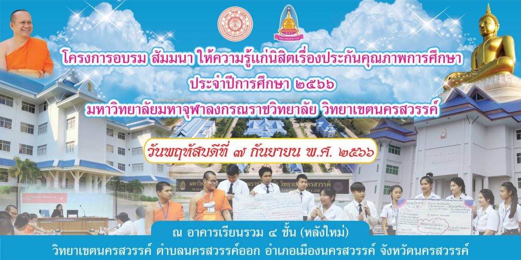 อบรม สัมมนา ให้ความรู้แก่นิสิตเรื่องประกันคุณภาพการศึกษาประจำปีการศึกษา ๒๕๖๖ มหาวิทยาลัยมหาจุฬาลงกรณราชวิทยาลัย วิทยาเขตนครสวรรค์ วันพฤหัสบดีที่ ๗ กันยายน พ.ศ. ๒๕๖๖ ณ อาคารเรียนรวม ๔ ขั้น (หลังใหม่) วิทยาเขตนครสวรรค์ ตำบลนครสวรรค์ออก อำเภอเมืองนครสวรรค์ จังหวัดนครสวรรค์