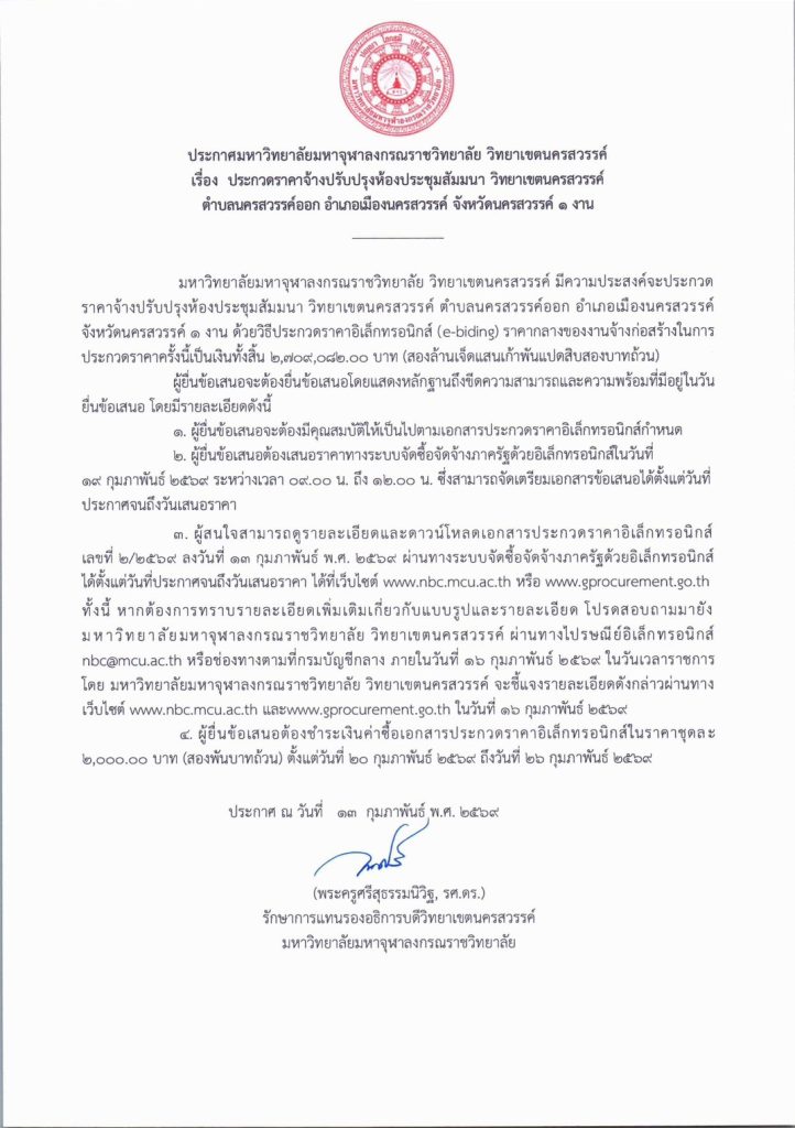 ประกาศมหาวิทยาลัยมหาจุฬาลงกรณราชวิทยาลัย วิทยาเขตนครสวรรค์ เรื่อง ประกวดราคาจ้างปรับปรุงห้องประชุมสัมมนา วิทยาเขตนครสวรรค์ ๑ งาน