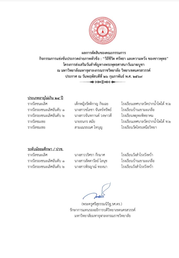 ผลการตัดสินของคณะกรรมการกิจกรรมการแข่งขันประกวดถ่ายภาพหัวข้อ : “วิถีชีวิต ศรัทธา และความหวัง ของชาวพุทธ”โครงการส่งเสริมวันสำคัญทางพระพุทธศาสนาวันมาฆบูชา ณ มหาวิทยาลัยมหาจุฬาลงกรณราชวิทยาลัย วิทยาเขตนครสวรรค์