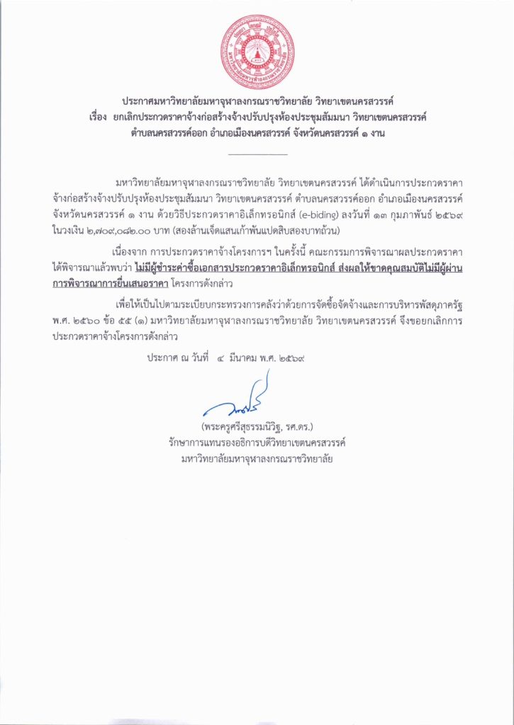 ประกาศมหาวิทยาลัยมหาจุฬาลงกรณราชวิทยาลัย วิทยาเขตนครสวรรค์ เรื่อง ยกเลิกประกวดราคาจ้างก่อสร้างจ้างปรับปรุงห้องประชุมสัมมนา วิทยาเขตนครสวรรค์ ตำบลนครสรรค์ออก อำเภอเมืองนครสรรค์ จังหวัดนครสวรรค์ ๑ งาน