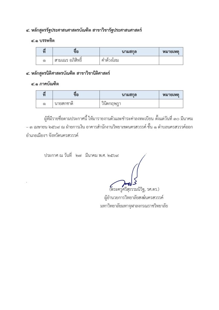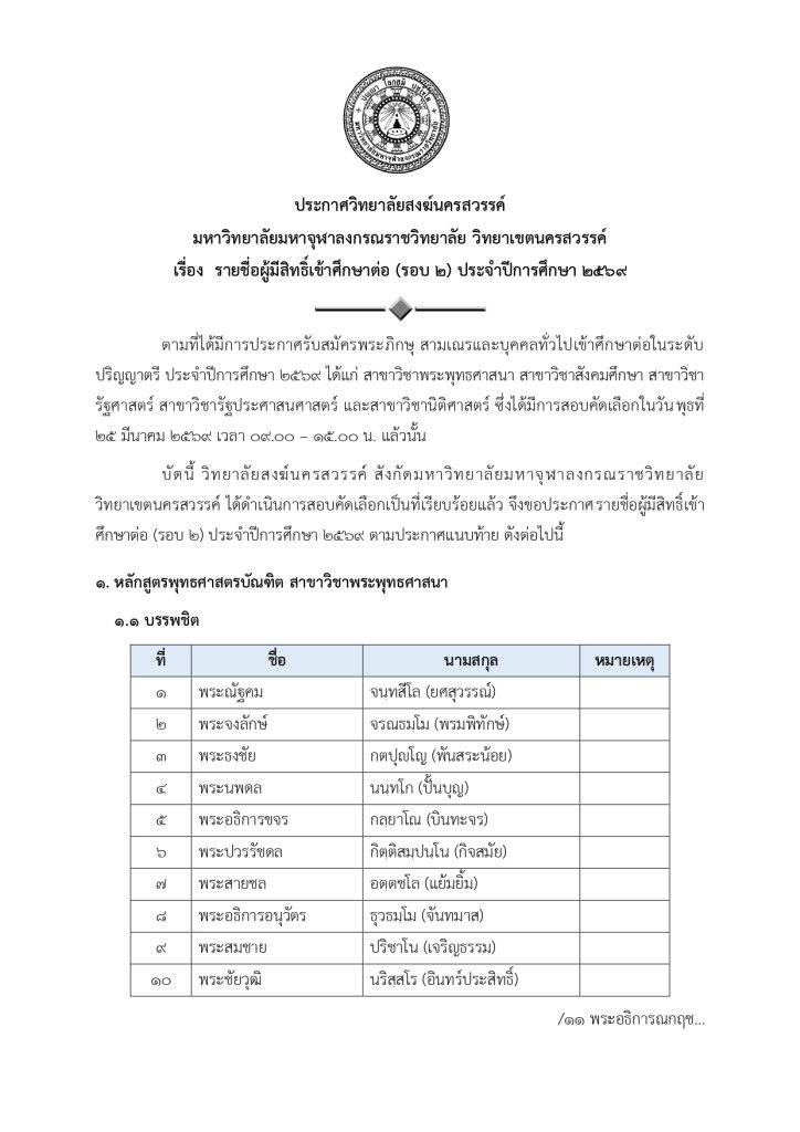 บัดนี้ วิทยาลัยสงฆ์นครสวรรค์ สังกัดมหาวิทยาลัยมหาจุฬาลงกรณราชวิทยาลัย วิทยาเขตนครสวรรค์ ได้ดำเนินการสอบคัดเลือกเป็นที่เรียบร้อยแล้ว จึงขอประกาศรายชื่อผู้มีสิทธิ์เข้าศึกษาต่อ (รอบ ๒) ประจำปีการศึกษา ๒๕๖๙ ตามประกาศแนบท้าย ดังต่อไปนี้