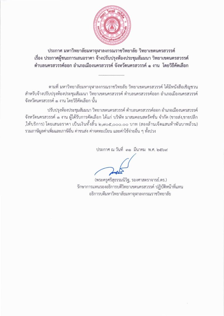 ประกาศ เรื่อง การประกาศผู้ชนะการเสนอราคา จ้างปรับปรุงห้องประชุมสัมมนา วิทยาเขตนครสวรรค์ ตำบลนครสรรค์ออก อำเภอเมืองนครสวรรค์ จังหวัดนครสวรรค์ ๑ งาน โดยวิธีคัดเลือก