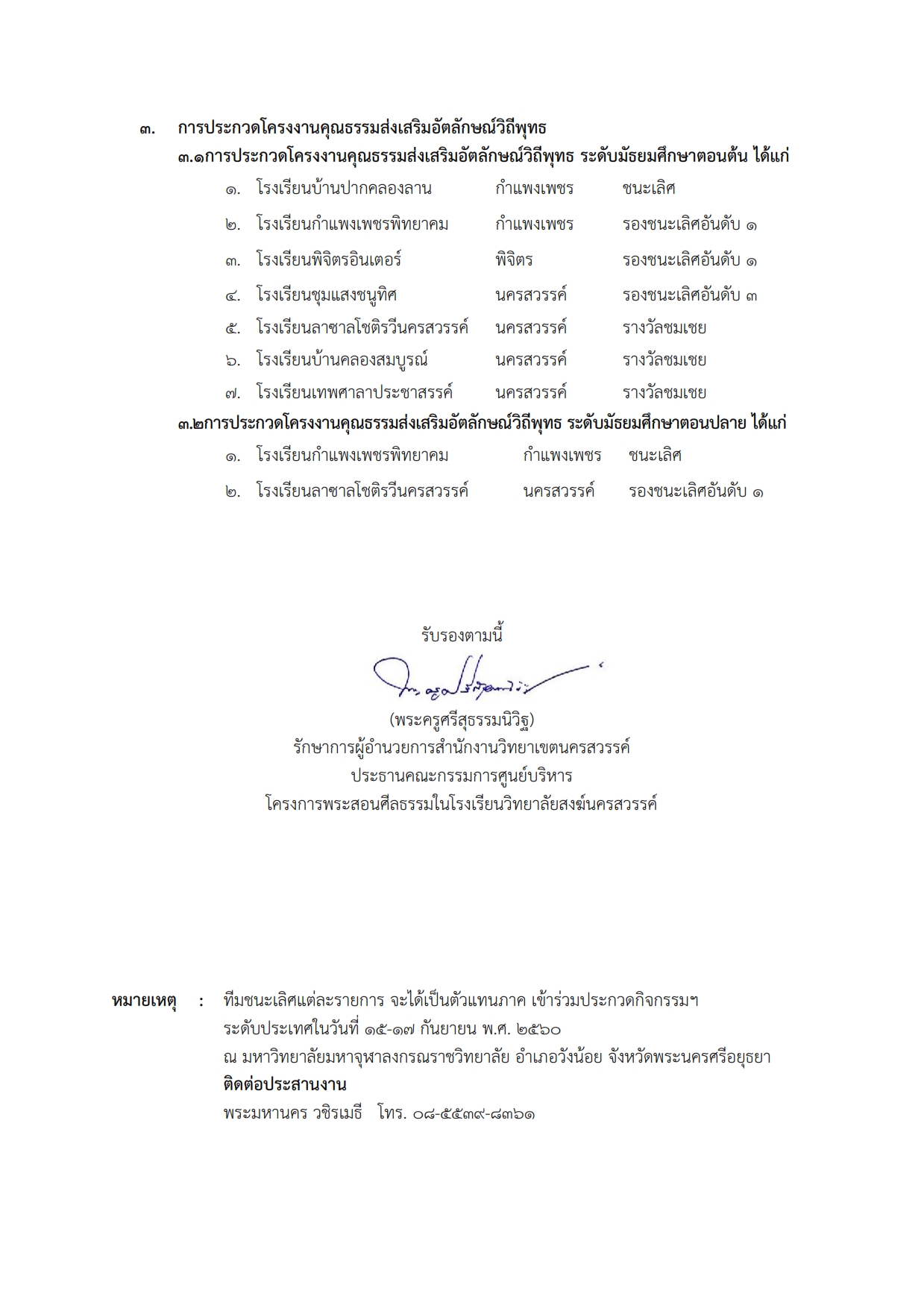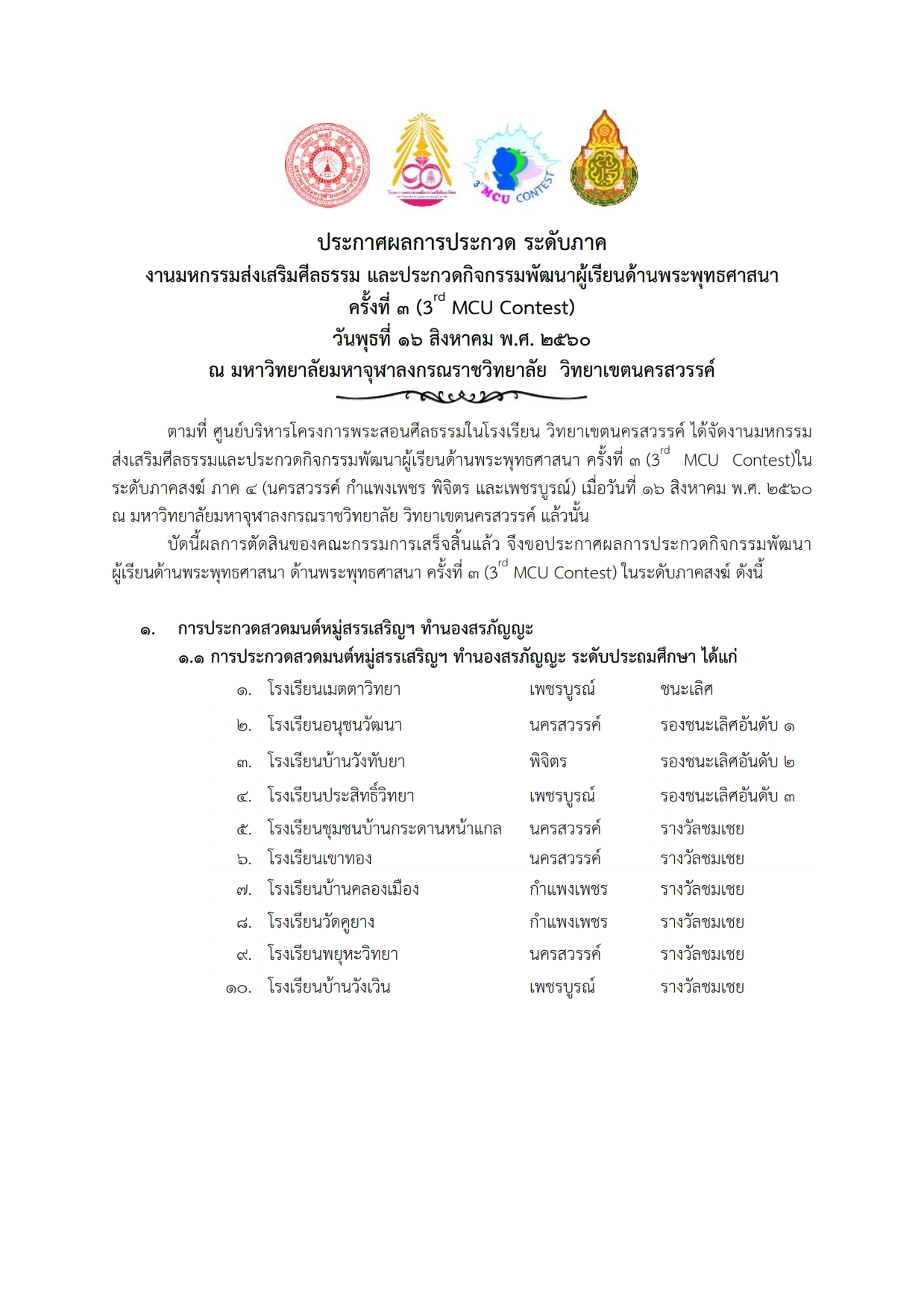 ประกาศผลการประกวด ระดับภาค งานมหกรรมส่งเสริมศีลธรรมฯ 0 By ณฐพัชร์ on 12/09/2017 ประชาสัมพันธ์ Share Facebook Twitter LinkedIn Pinterest Email ประกาศผลการประกวด ระดับภาค งานมหกรรมส่งเสริมศีลธรรม และประกวดกิจกรรมพัฒนาผู้เรียนด้านพระพุทธศาสนา ครั้งที่ ๓ (3rd MCU Contest) **ทีมชนะเลิศแต่ละรายการ จะได้เป็นตัวแทนภาค เข้าร่วมประกวดกิจกรรมฯ ระดับประเทศในวันที่ ๑๕-๑๗ กันยายน พ.ศ. ๒๕๖๐ ณ มหาวิทยาลัยมหาจุฬาลงกรณราชวิทยาลัย อำเภอวังน้อย จังหวัดพระนครศรีอยุธยา **ติดต่อประสานงาน พระมหานคร วชิรเมธี โทร. ๐๘-๕๕๓๙-๘๓๖๑ Related posts:ขอแสดงความยินดีแด่ ผศ. อนงค์นาฏ แก้วไพฑูรย์พิธีเจริญพระพุทธมนต์เฉลิมพระเกียรติสมเด็จพระกนิษฐาธิราชเจ้า กรมสมเด็จพระเทพรัตนราชสุดา ฯ เนื่องในโอก...แนะแนวการศึกษาโรงเรียนห้วยน้ำหอมพิทยาคาร