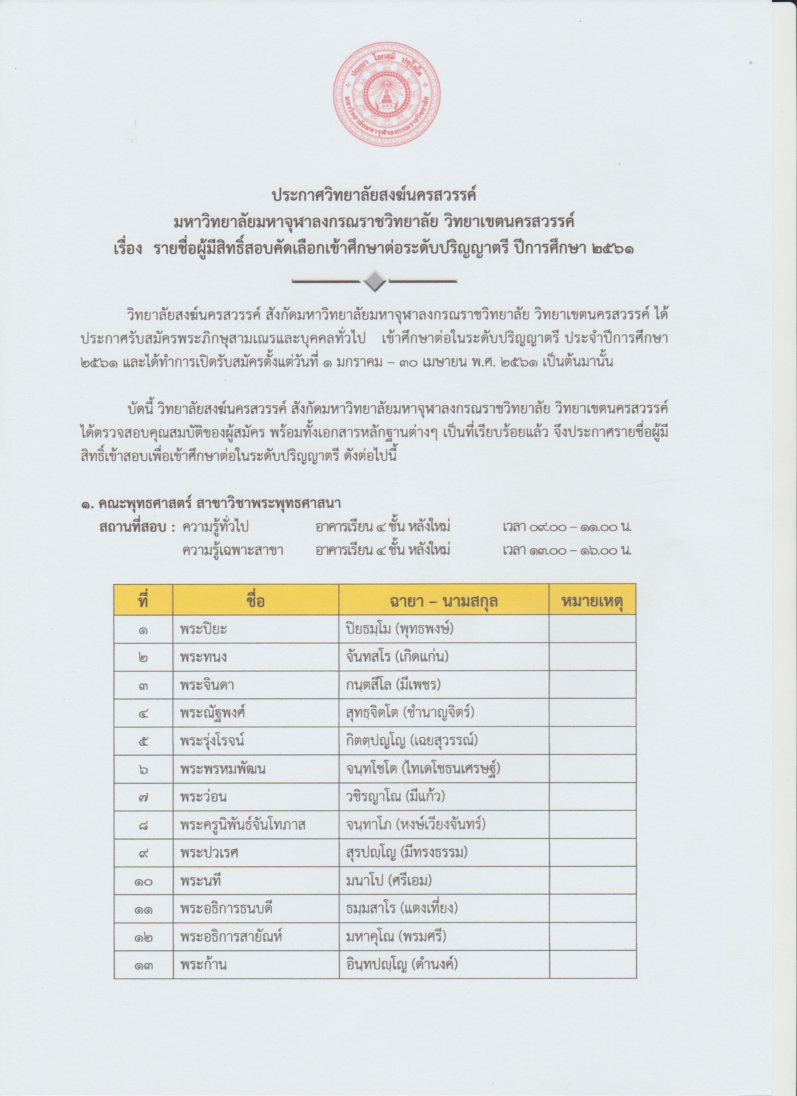 ประกาศรายชื่อผู้มีสิทธิ์สอบคัดเลือก เข้าศึกษาต่อระดับปริญญาตรี ประจำปีการศึกษา ๒๕๖๑